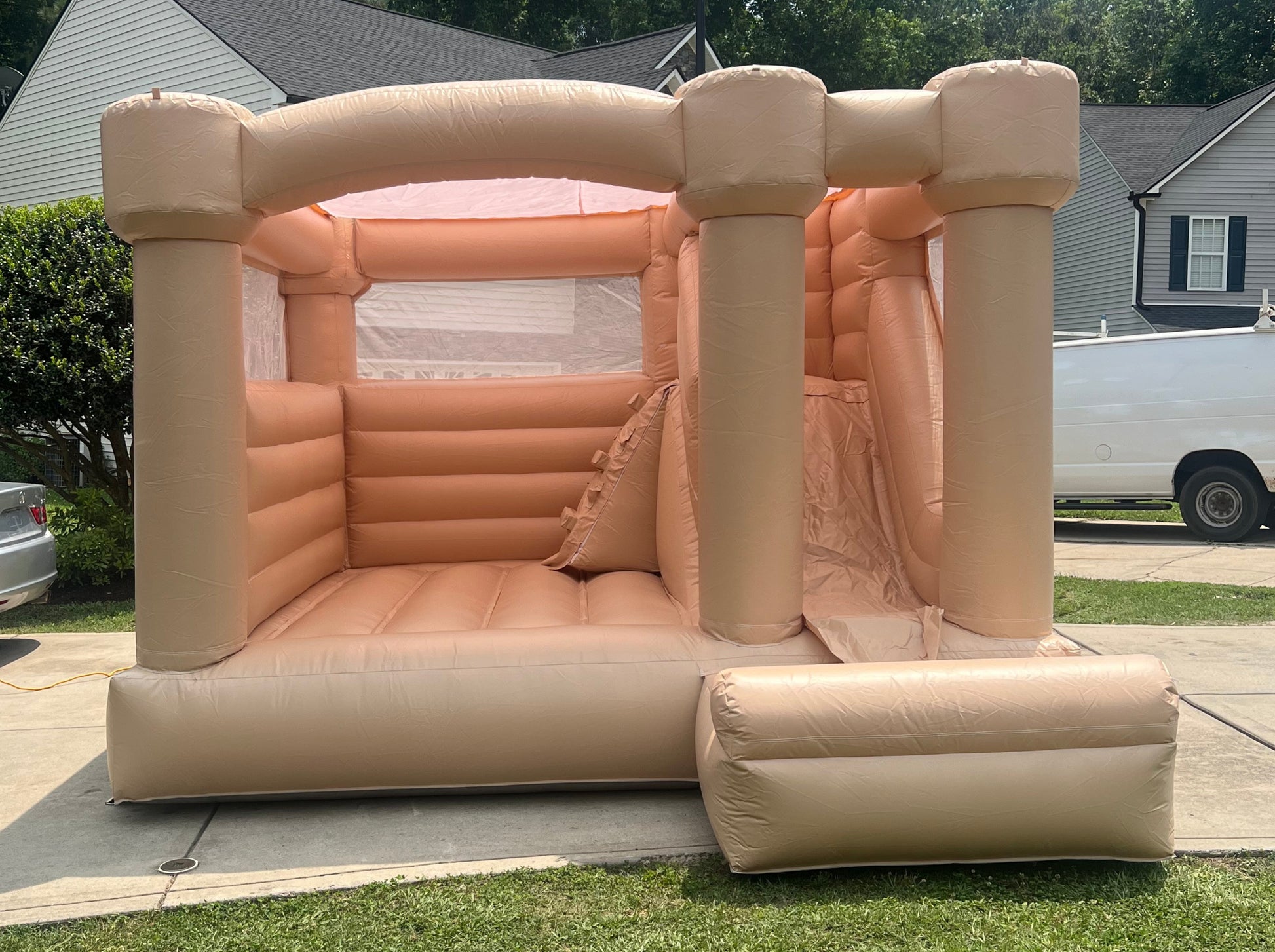 12X12 TAN BOUNCE HOUSE WITH SLIDE AND SUN ROOF. PERFECT FOR ALL AGES.