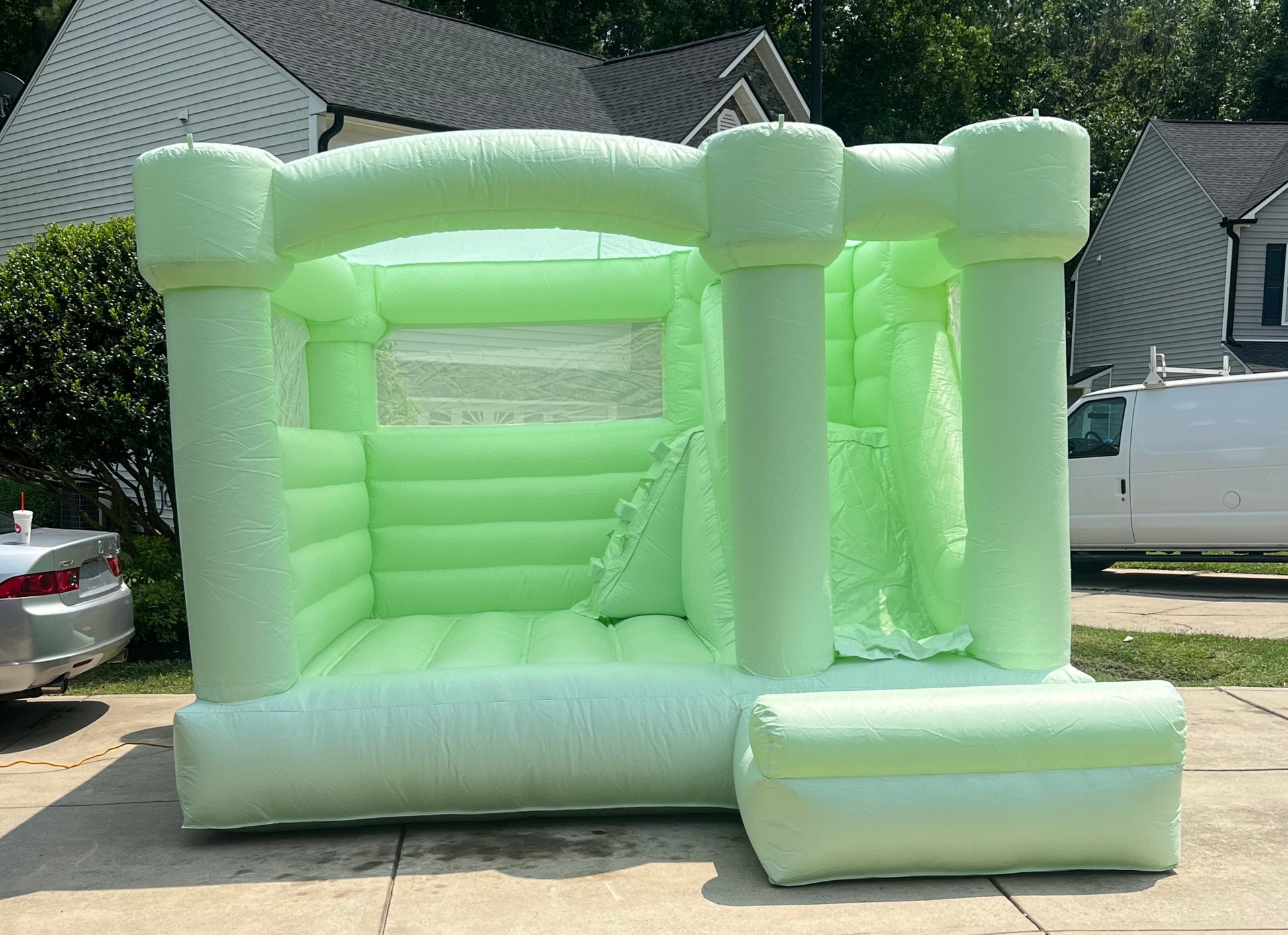 12X12 MINT GREEN BOUNCE HOUSE WITH SLIDE AND SUN ROOF. PERFECT FOR ALL AGES.